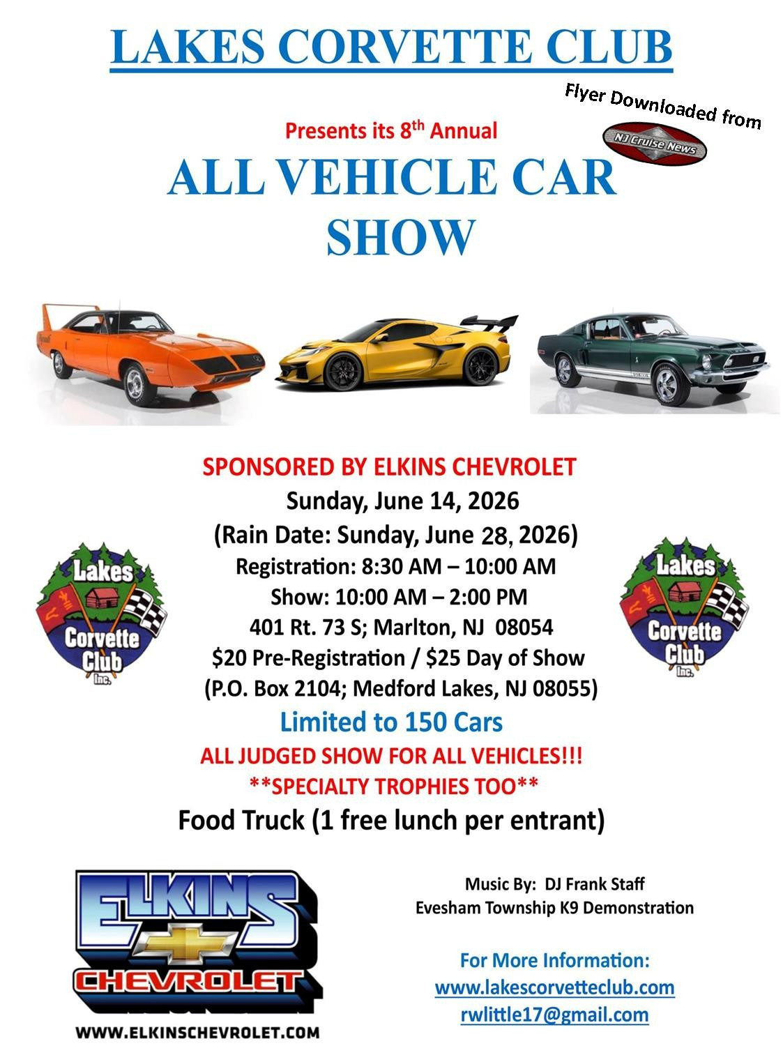 All judged show for all vehicles, Trophies, Music by DJ Frank Staff, Evesham Twp K9 Demonstration, Food Truck (registration includes 1 free lunnch)